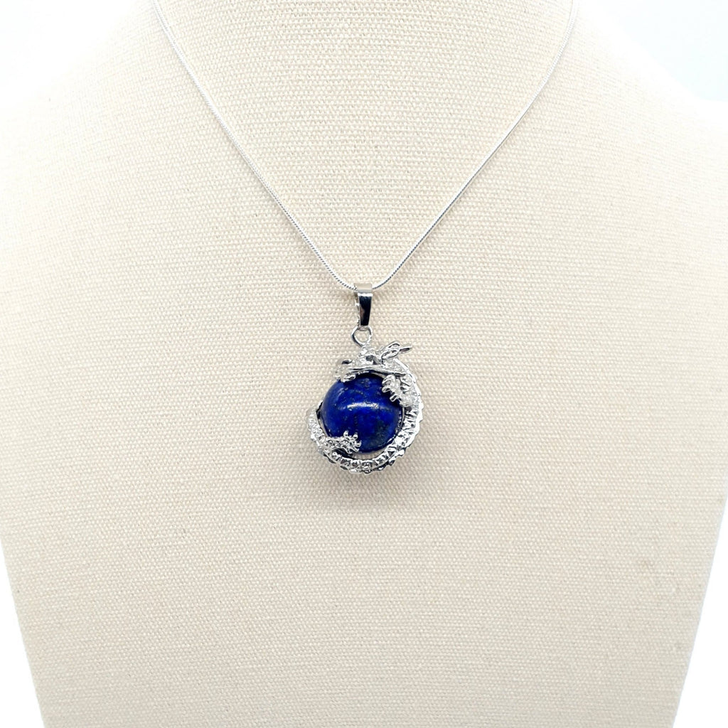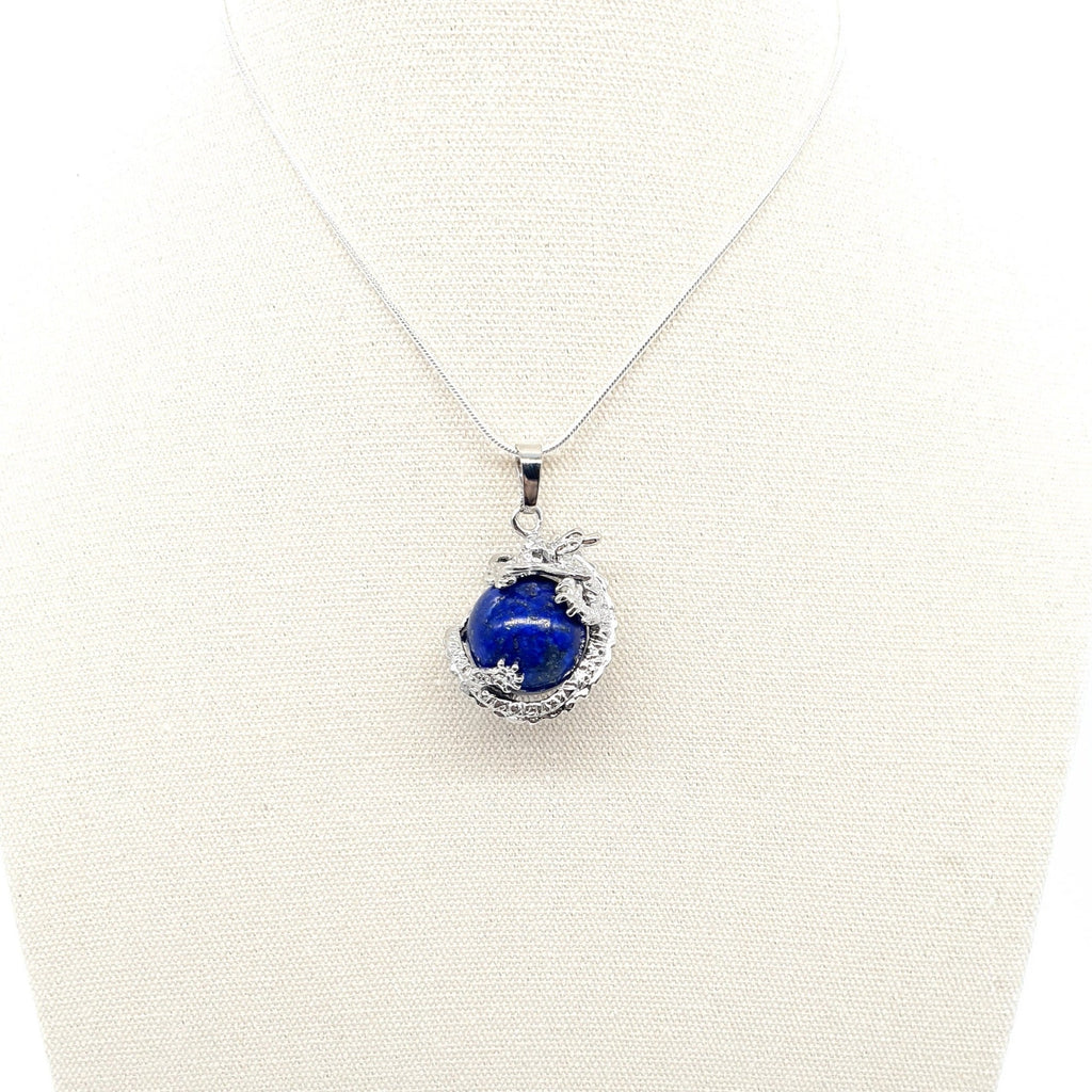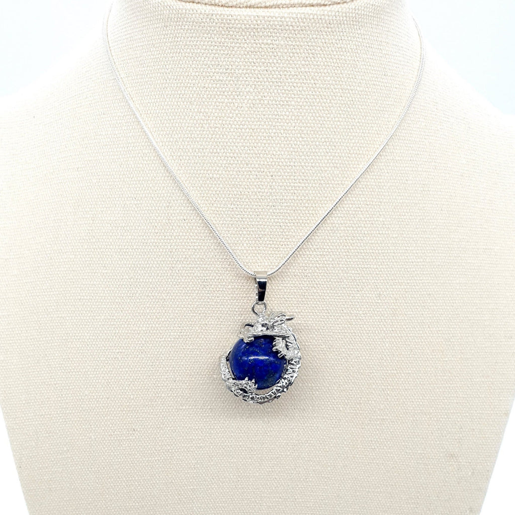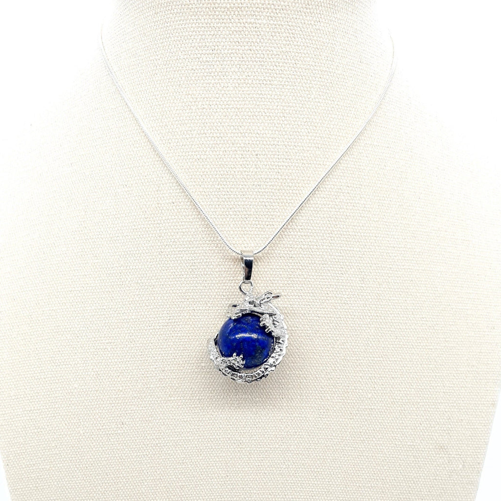 Blue Lapis Lazuli Crystal Ball Necklace Pendant With Silver Dragon