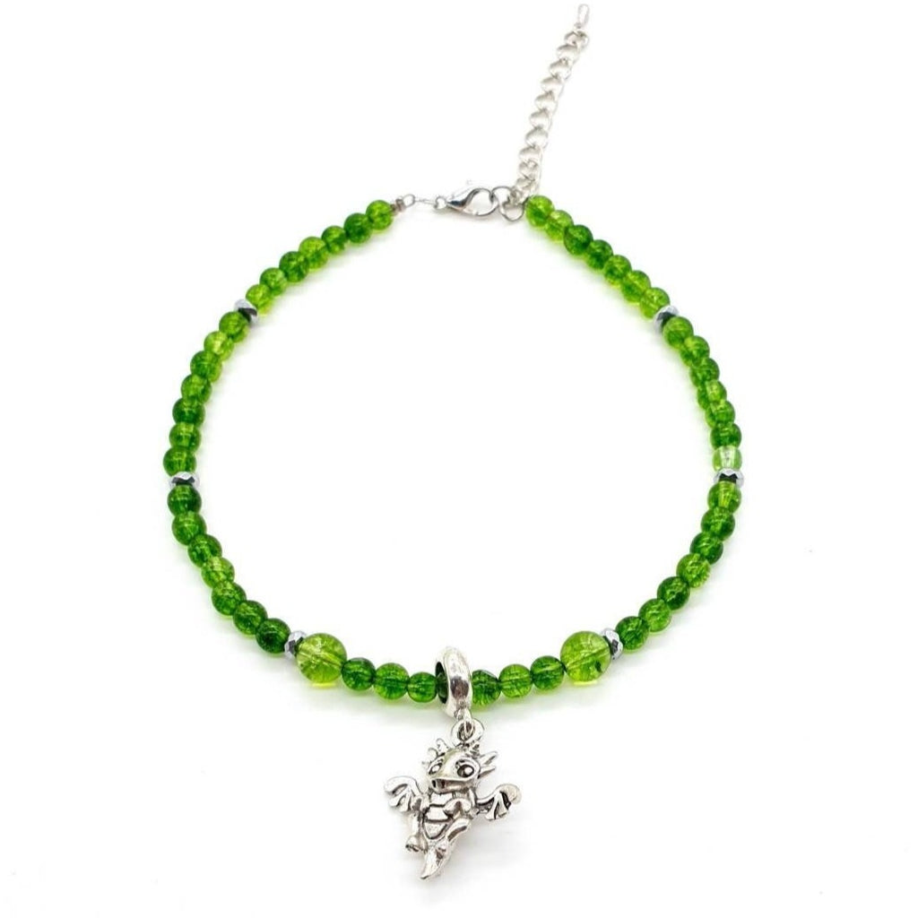 Green Peridot Crystal Anklet With Silver Dragon Pendant