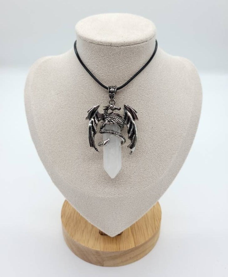 Large Point Clear Quartz Necklace Pendant With Dragon