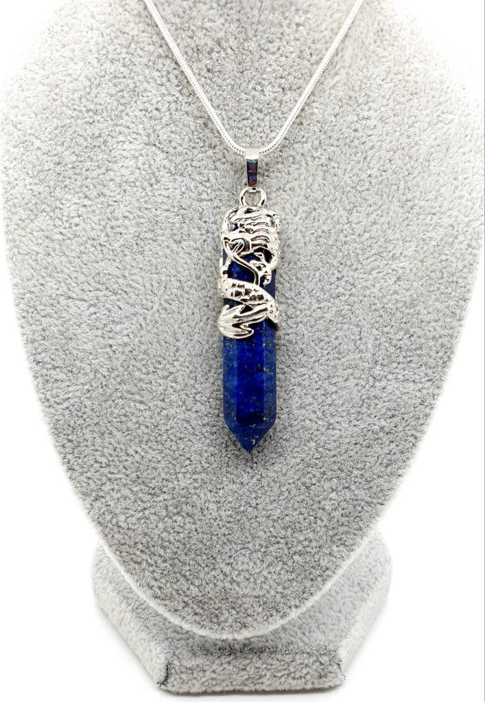 Point Blue Lapis Lazuli Crystal Necklace Pendant With Silver Dragon