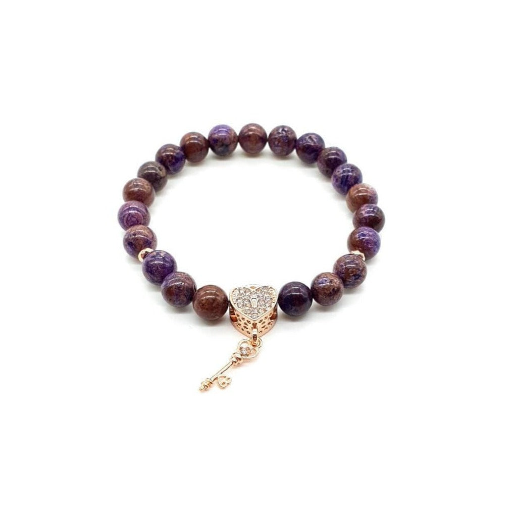 Purple Charoite Crystal Beaded Bracelet With Rose Gold Heart Charm
