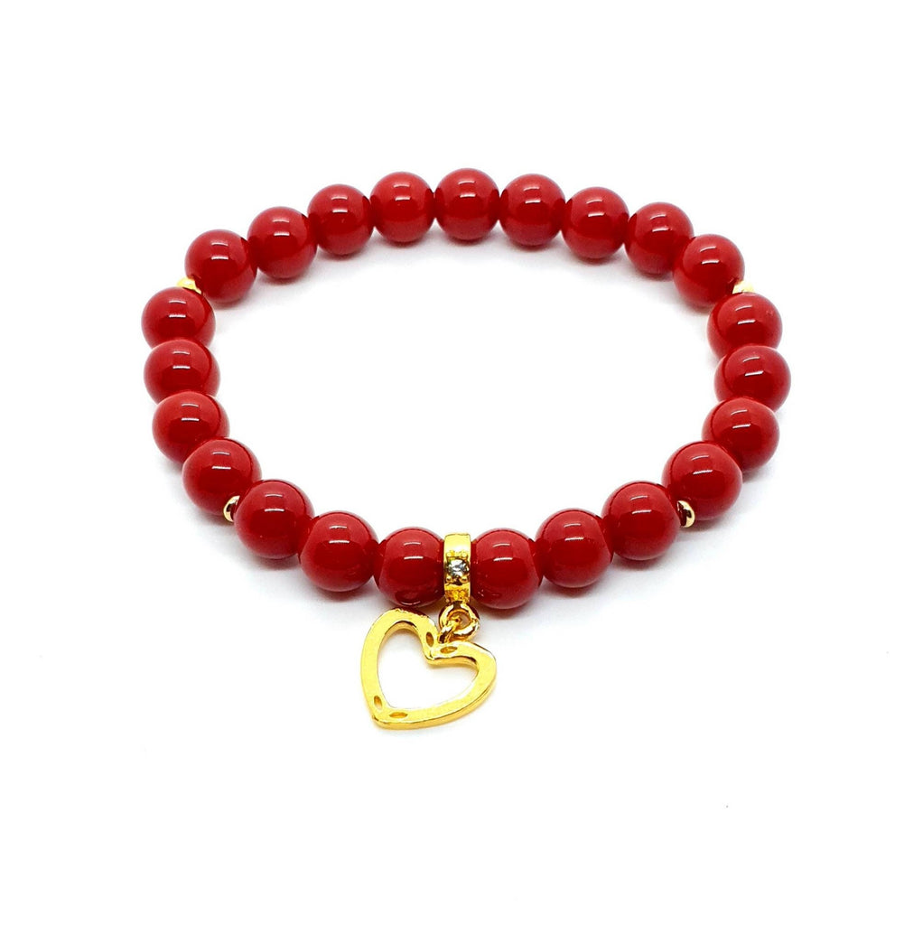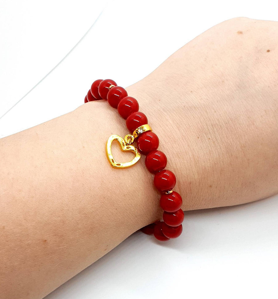 Red Coral Crystal Beaded Bracelet With Gold Heart Charm