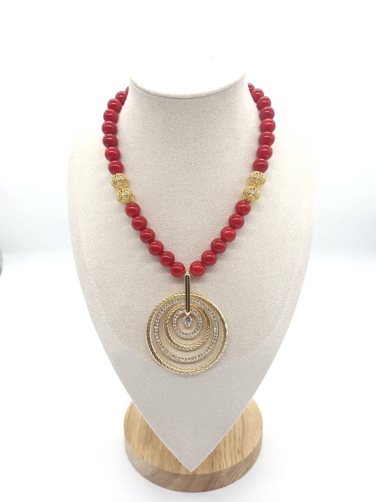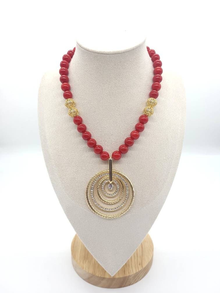 Red Coral Crystal Beaded Necklace With Gold Gemstone Pendant