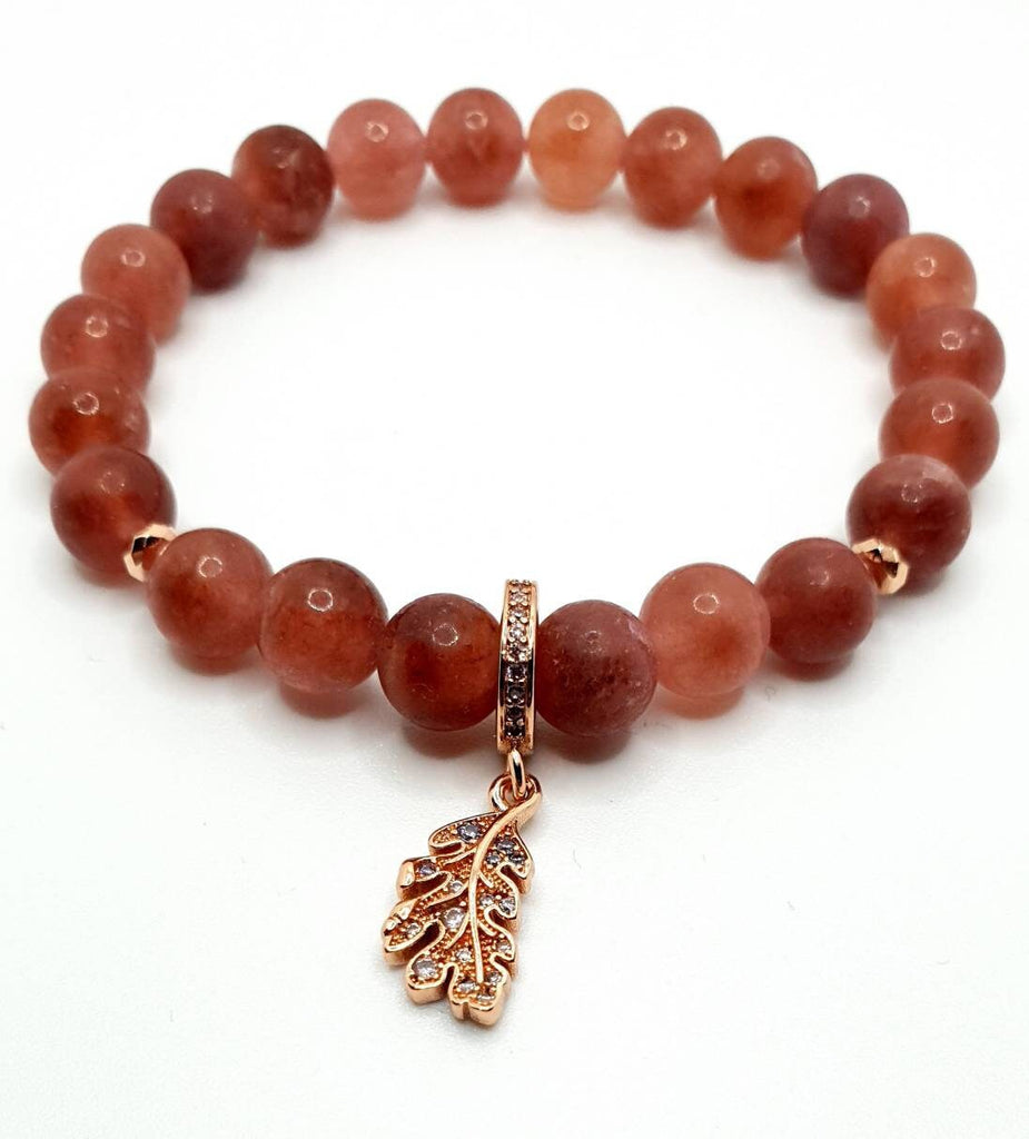 Strawberry Quartz Crystal Beaded Bracelet With Rose Gold Leaf Charm